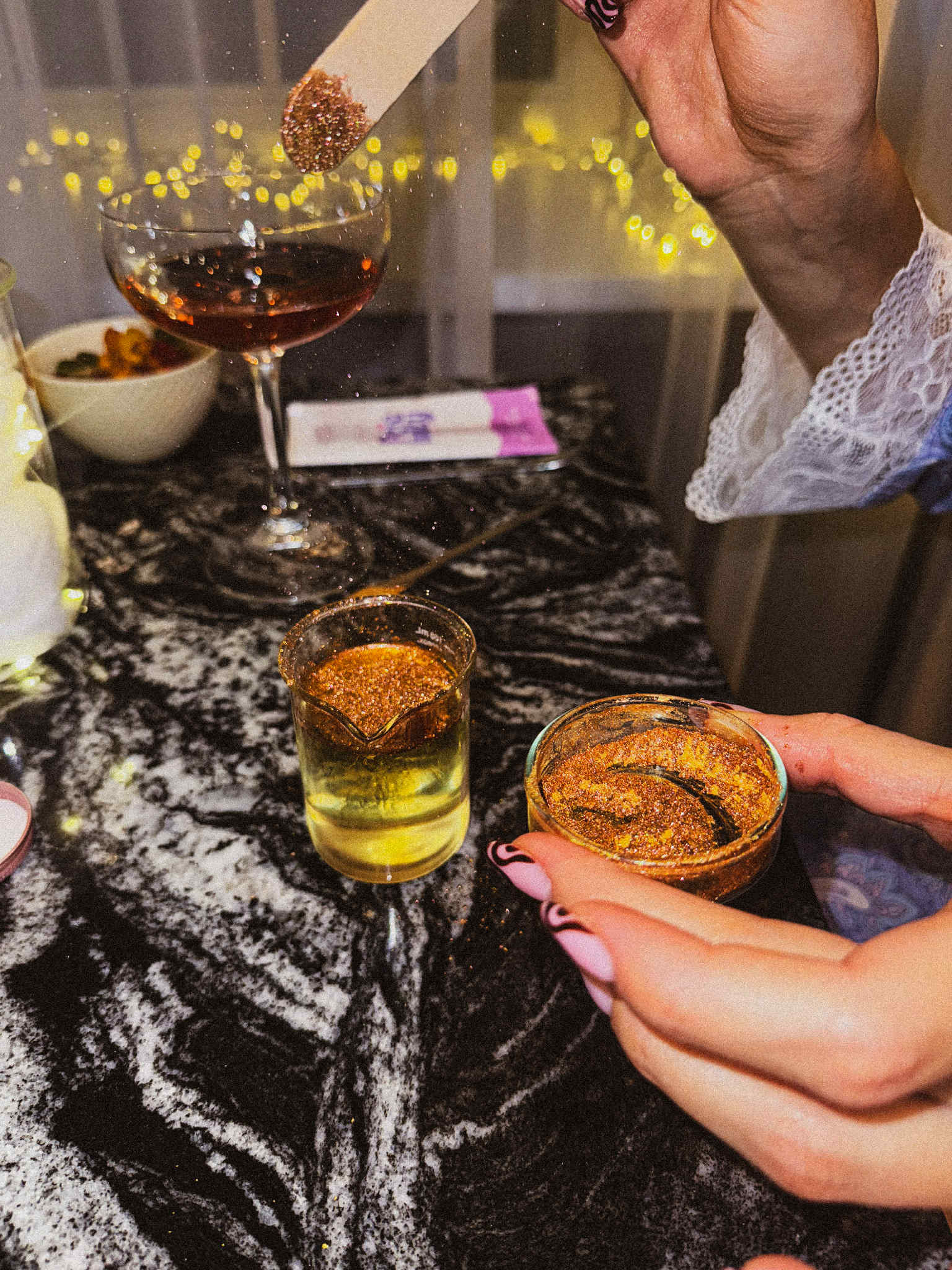 5. Now you can decide: leave the body oil colorless (naturally yellow) or add pigment (make it shimmer!).